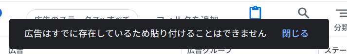 Google 広告で広告を別の広告グループへコピーしようとした際、「広告はすでに存在しているため貼り付けることはできません」という通知が表示されることがあります。これは、コピー先の広告グループ内に、同じ構成の広告がすでに登録されている場合に起きる仕組みです。Google は同一アセットを重複として扱うため、そのままでは貼り付けが拒否されます。