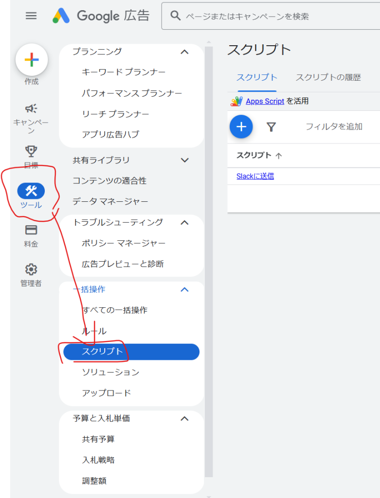 Google Ads Scriptは、Google Adsの管理画面内から利用する。具体的には、Google Adsアカウントにログイン後、画面上部の「ツールと設定」メニューから「スクリプト」を選択することでアクセス可能である。この画面では、新たなスクリプトの作成や既存スクリプトの編集、実行結果の確認などが行えるようになっている。