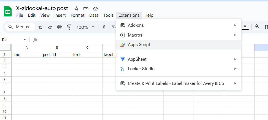 From the spreadsheet menu, click “Extensions” -> “Apps Script”. This opens the GAS editor linked to this sheet.