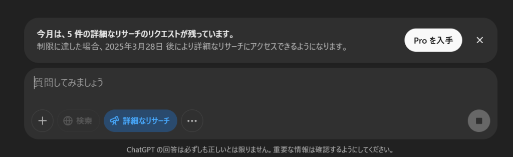 ChatGPT PlusアカウントでのDeep Researchは何回?→おそらく10回 2025/02/26時点 この記事の内容について、業務や開発でお困りの場合は個別に対応できます。 ZIDOOKA! 2025.02.26 0 今日からDeep ResearchがPlusアカウントでも使えるように! しかし、月に10回が限度のようです・・・トホホ。でも使えるだけありがたい!