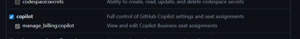 Copilot Premium Usage Monitorでは、個人の利用状況を取得するためにGitHub Personal Access Tokenの設定が求められます。設定画面では以下のような権限が候補に表示されますが、重要なのは読み取り権限です。