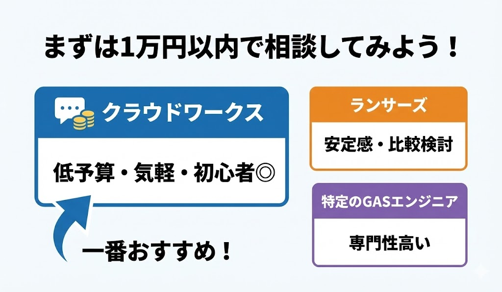 | 特定のGASエンジニア個人 | 〜3〜10万 | 専門性高い | 具体要件ある人 |