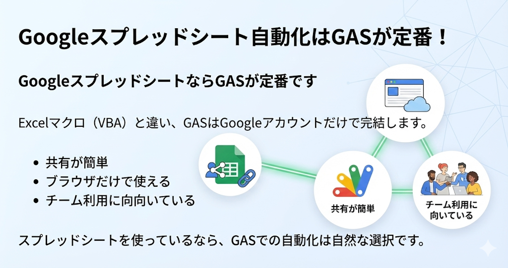 スプレッドシートを使っているなら、GASでの自動化は自然な選択です。