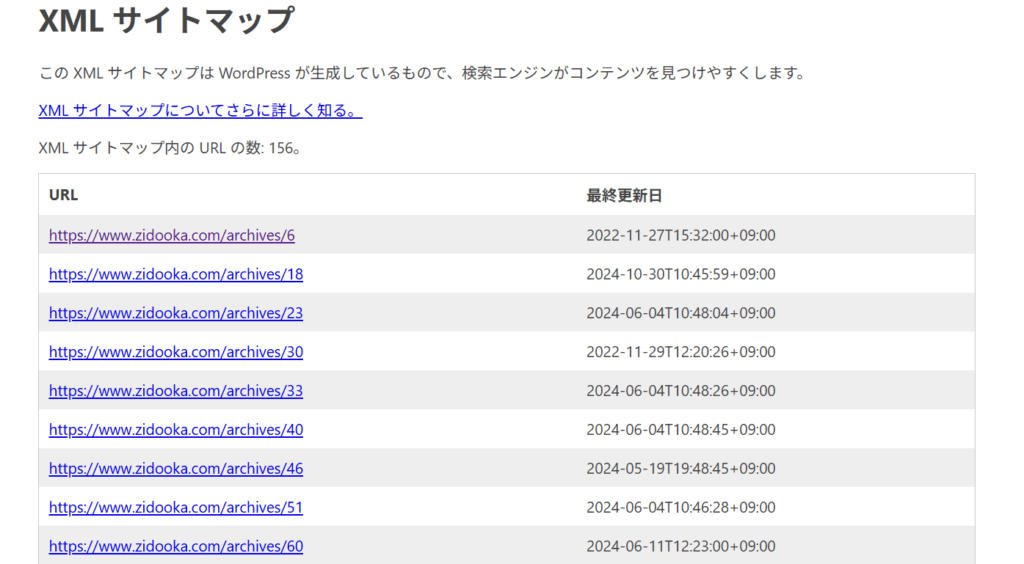 | 1 | サンプルページ | https://www.zidooka.com/sample-page | 2022-11-26 19:50:33 |